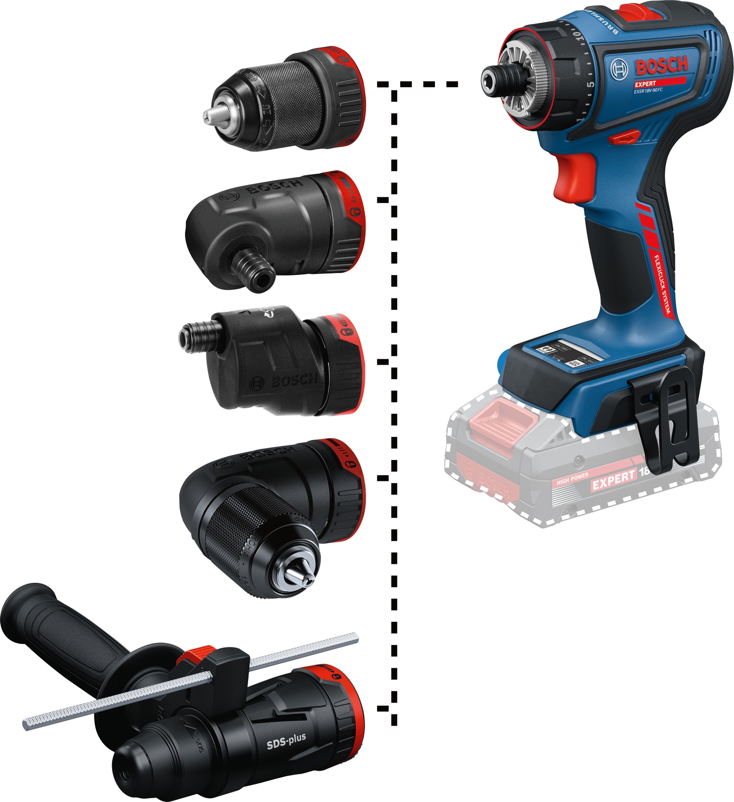 - Výkonný EXSR18V-90FC EXPERT nabízí flexibilitu 6 v 1 díky snadno vyměnitelným nástavcům pro vrtání a šroubování. Je součástí všestranného systému Bosch Professional FlexiClick, který se připravuje na různé výzvy na stavbě